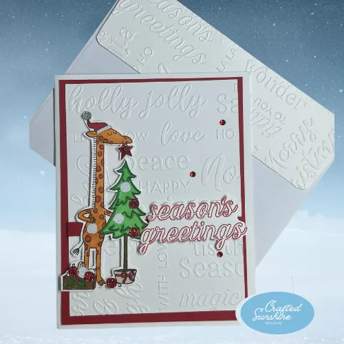 Spread joy and smiles this holiday season with this handmade giraffe Christmas card! Featuring a tall, cheerful giraffe carefully placing a star on top of a Christmas tree, this design captures the fun and wonder of the holidays in a lighthearted way. The background features embossed festive words like magic, holly jolly, and ’tis the season, adding subtle texture and charm.
