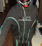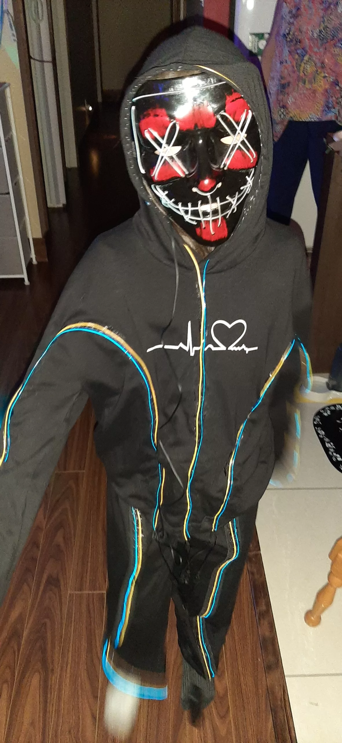 This is a costume that is hand made. It has strings of lights and a mask that lights up. It is battery powered so no danger. It was a lot of work and selling short of the cost and time it took. I hope some child will enjoy it! the body is made of cotton material so breathable as well. Hand wash only. I cannot add video to this site so you can email me to see a video of costume in action!! feistylady0@nullgmail.com