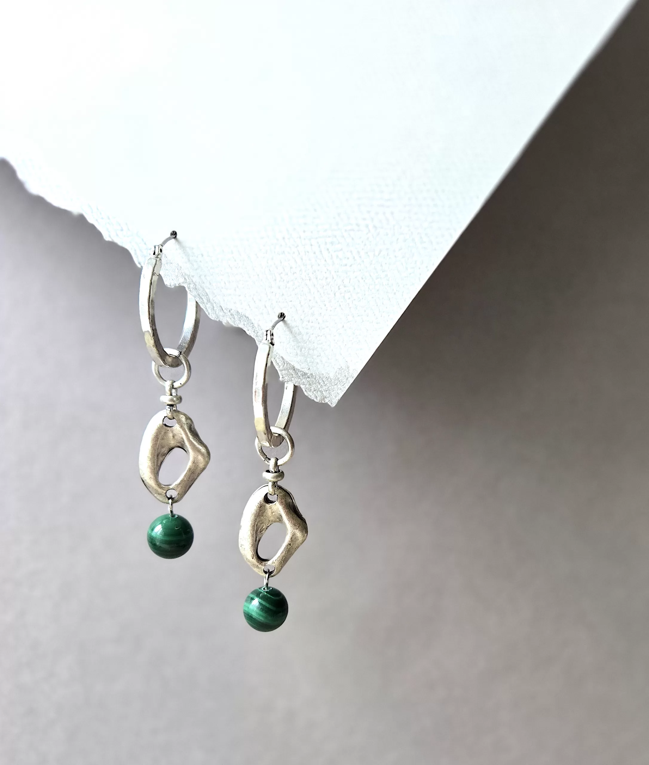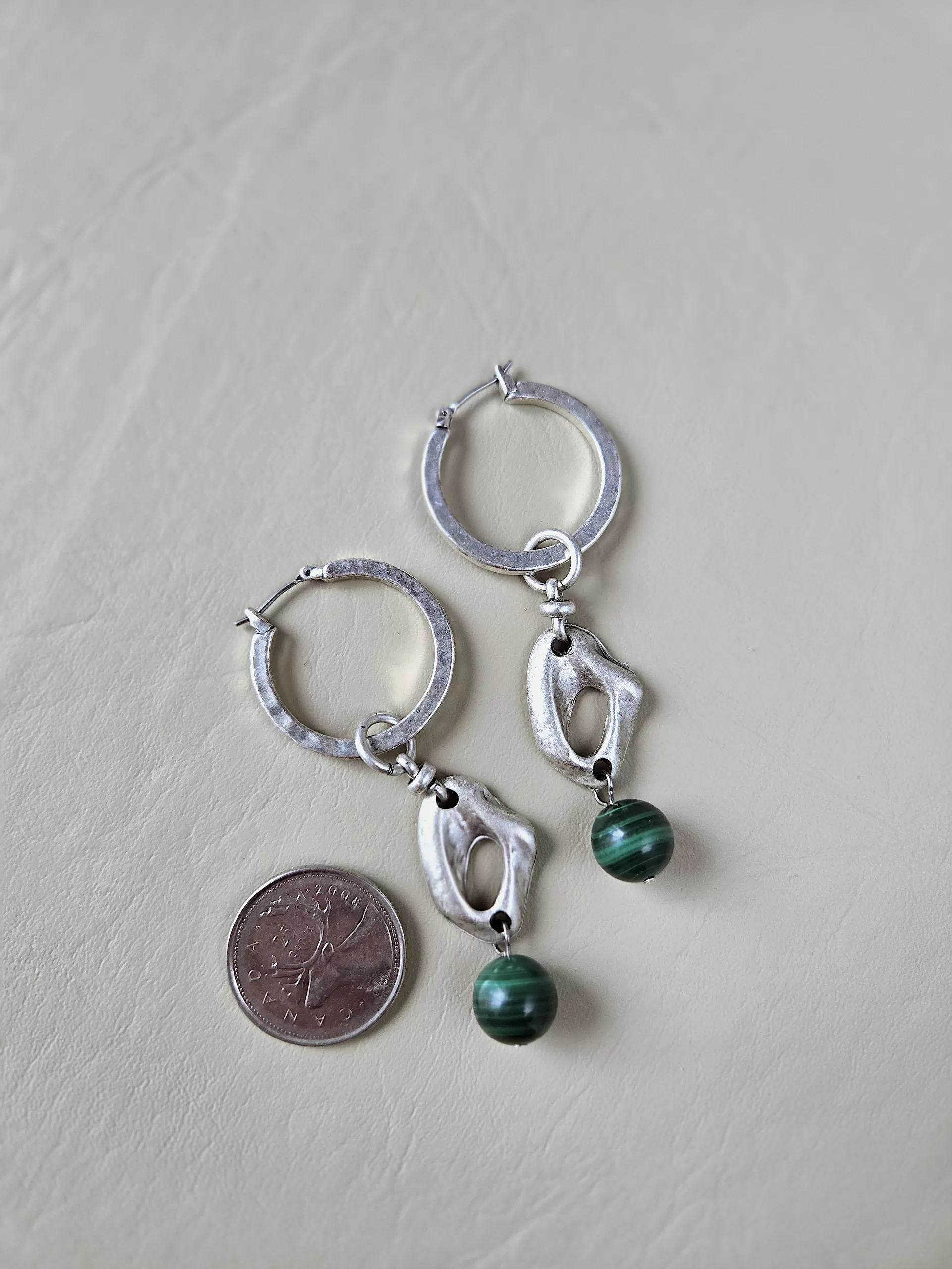 Bohemian pewter convertible hinge closure hammered hoops with irregular pewter drops with Malachite ball drops. Add more charms or remove to wear plain.