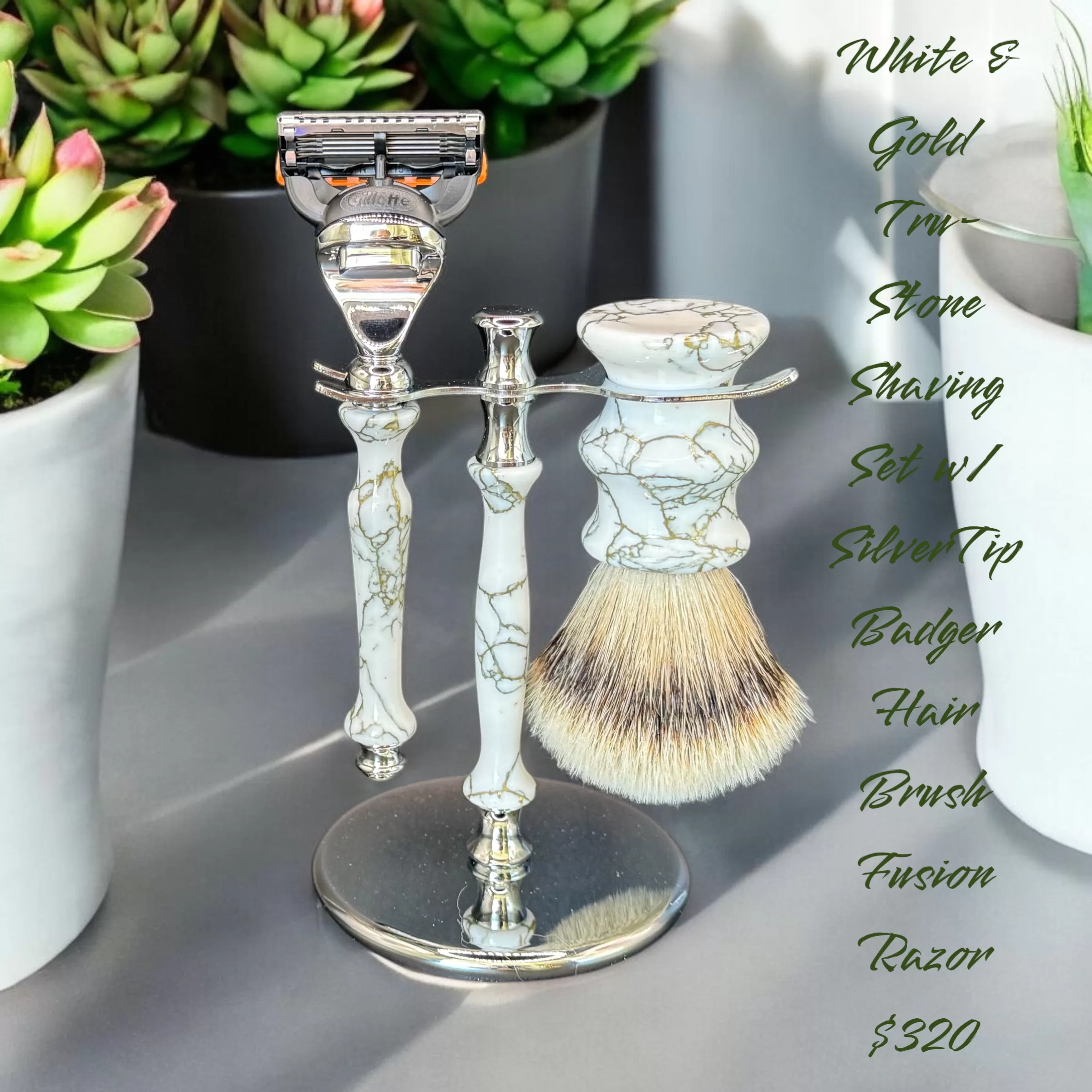 White & Gold web Tru-stone Shaving Set with a Silver Tip Badger Hair Brush.