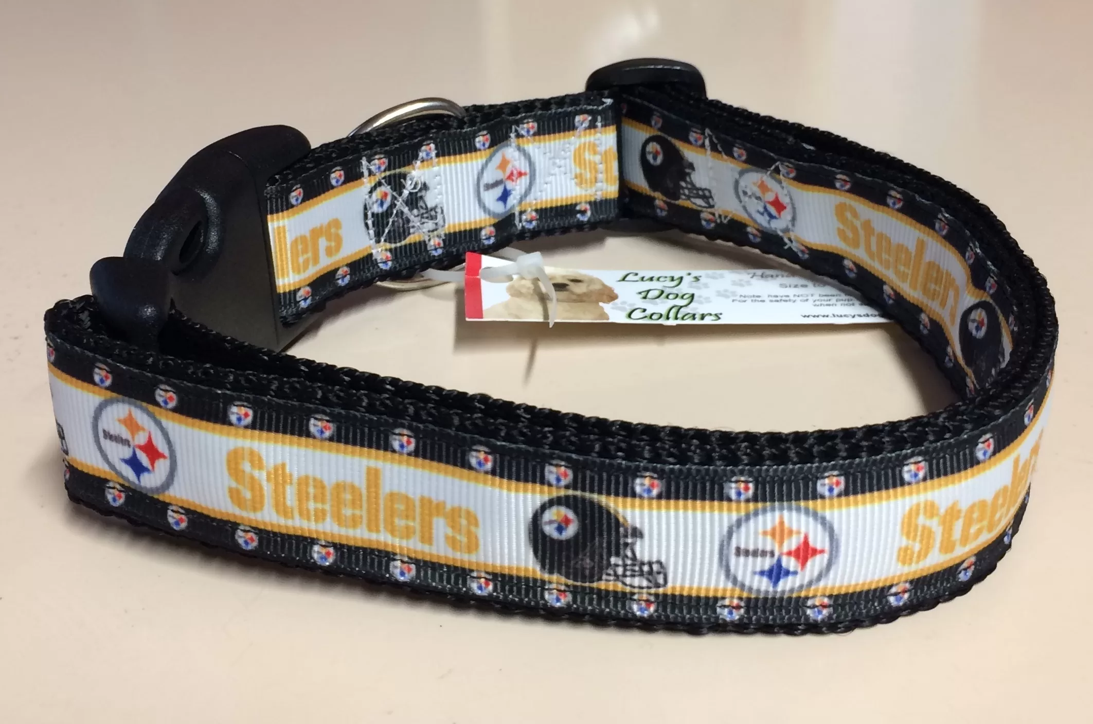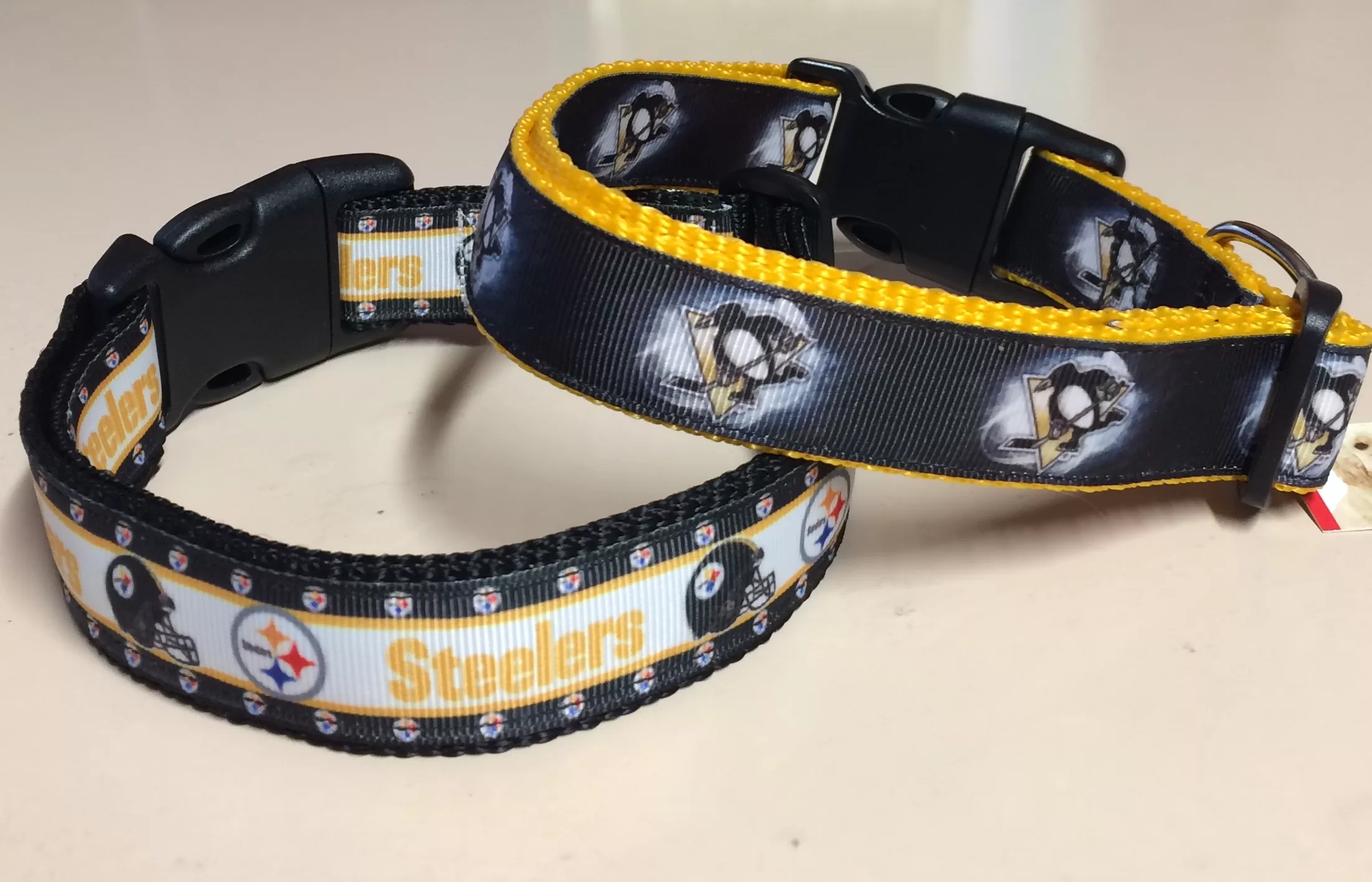 Show your support for your favorite sport team! These collars feature ribbon sewn on our strong webbing with welded hardware and sturdy buckles.