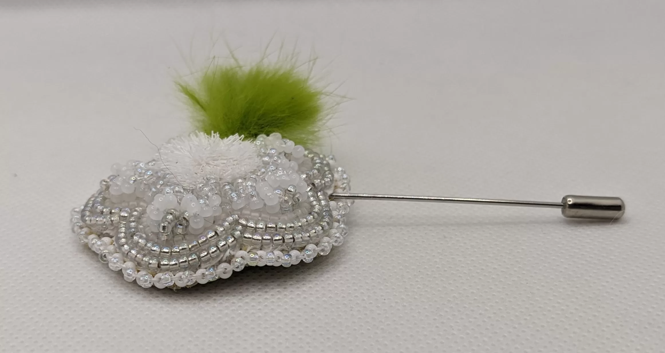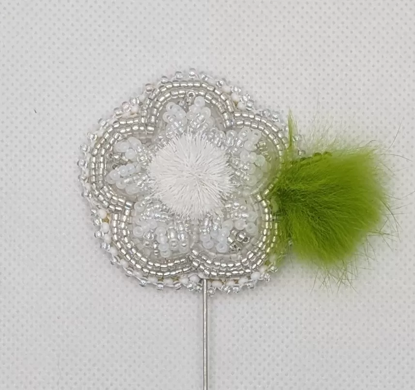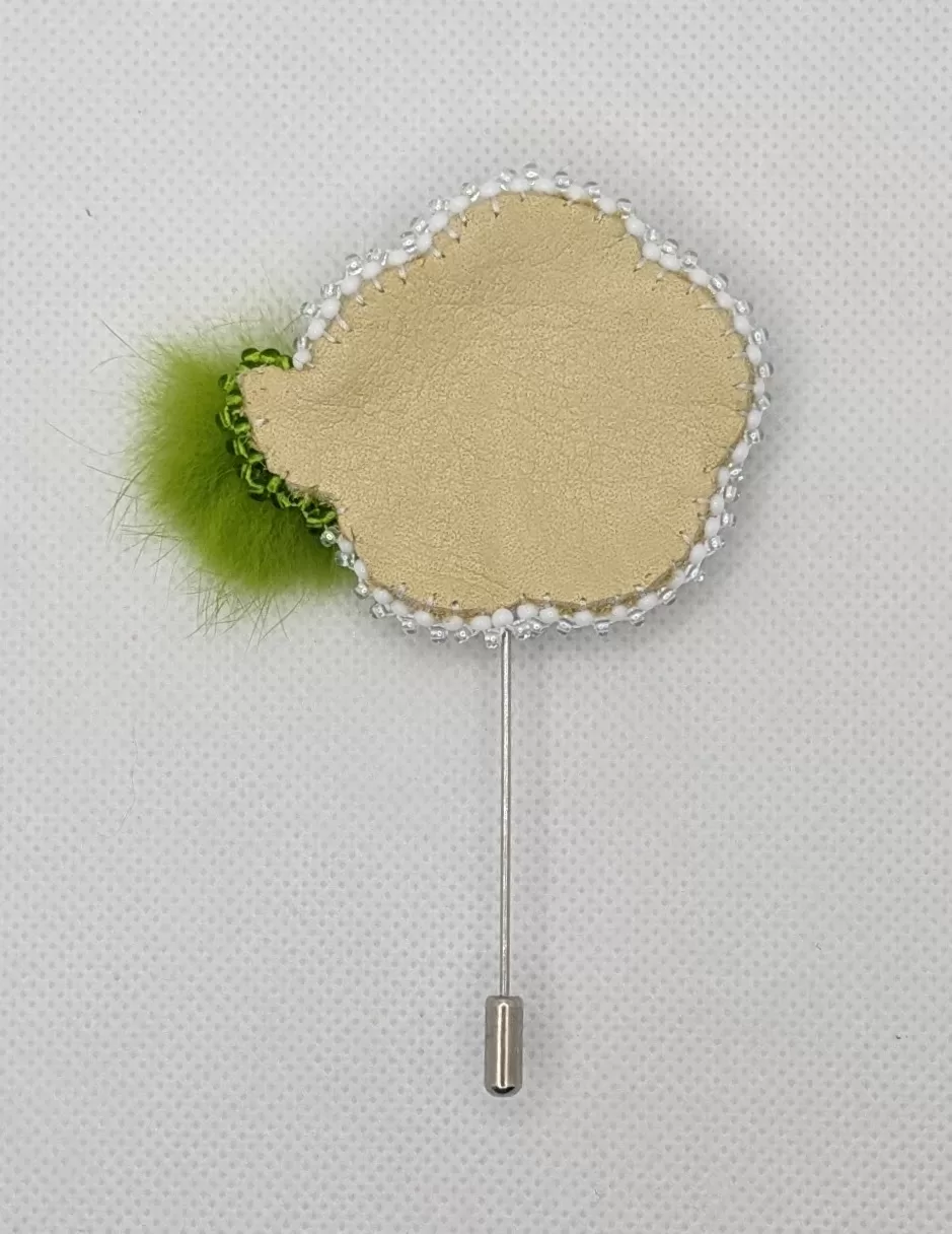 Beautiful floral sash pin with raised beadwork featuring a caribou tuft center, a green rabbit fur leaf, and a picot beaded edge. Soft moose hide backing with 1.75″ length silver pin. Beaded pin part is 1.75″ length and a 2.5″ width. Overall pin length is 3.75″